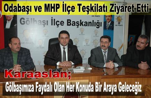 Gölbaşı belediye Başkanı Yakup Odabaşı, MHP Gölbaşı İlçe Başkanı Selçuk Dağdelener ,bazı MHP Meclis Üyeleri ve ilçe teşkilatı kalabalık bir gurup eşliğinde yeni seçilen Ak Parti Gölbaşı İlçe Başkanına ziyatte bulundular.
