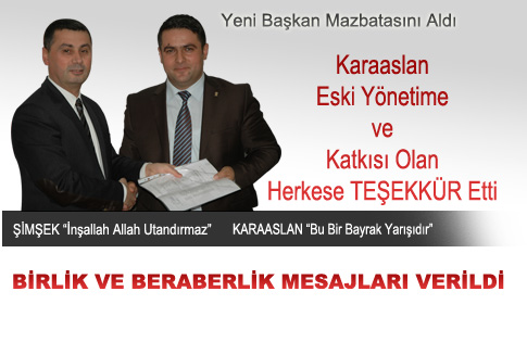 Eski Başkan Ramazan Şimşek'den mazbatayı düzenlenen bir törenle alan yeni başkan Osman Karaaslan birlik ve beraberlik içerisinde herkesin katkılarıyla İlçe yönetiminin sağlanacağını vurguladı.