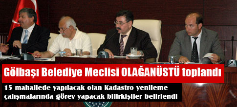Gölbaşı Belediye Meclisi Olağanüstü toplanarak, Gölbaşı Belediyesi sınırları içerisinde bulunan 15 mahallede yapılacak olan kadastro yenileme çalışmalarında görev yapacak bilirkişileri belirledi.